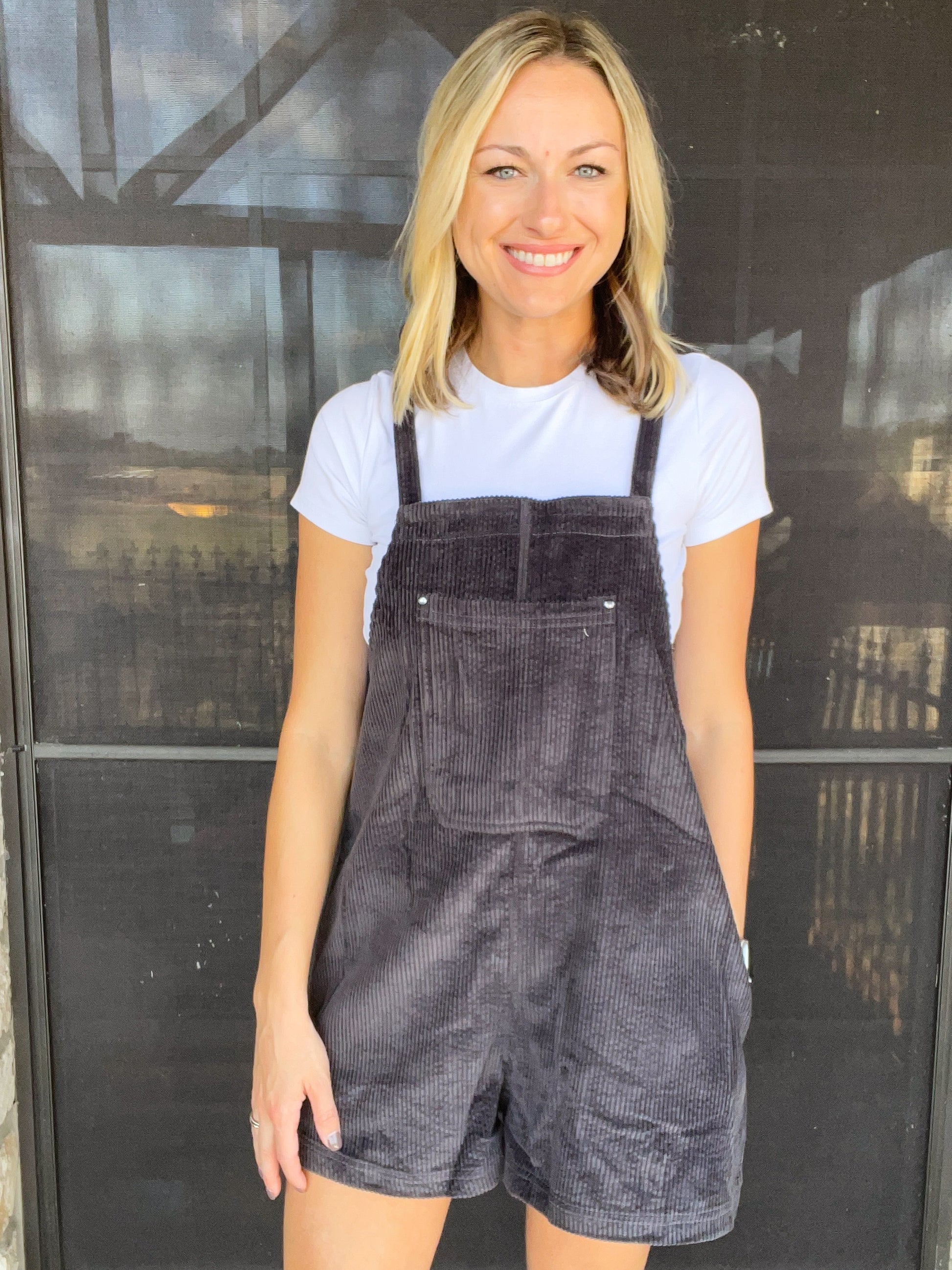 - Charcoal Corduroy Short Overall with Pockets and Adjustable Straps